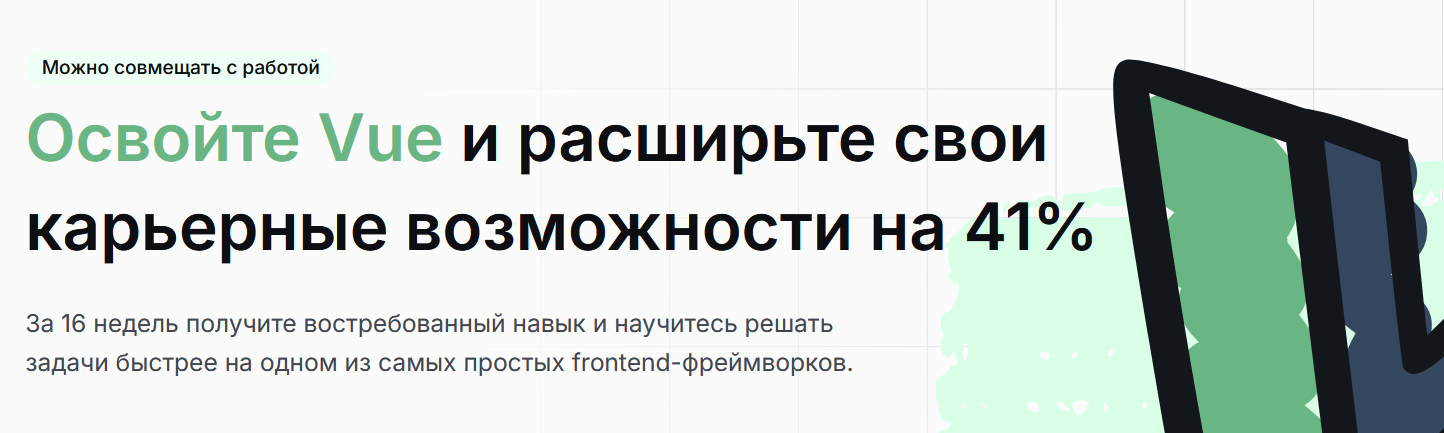 С Vue вы расширяете объем доступных вакансий на 40%, если знаете React, и 200% — если кодите на Angular. - Планируете увеличить свой доход и расширить навыки до fullstack